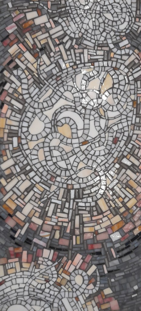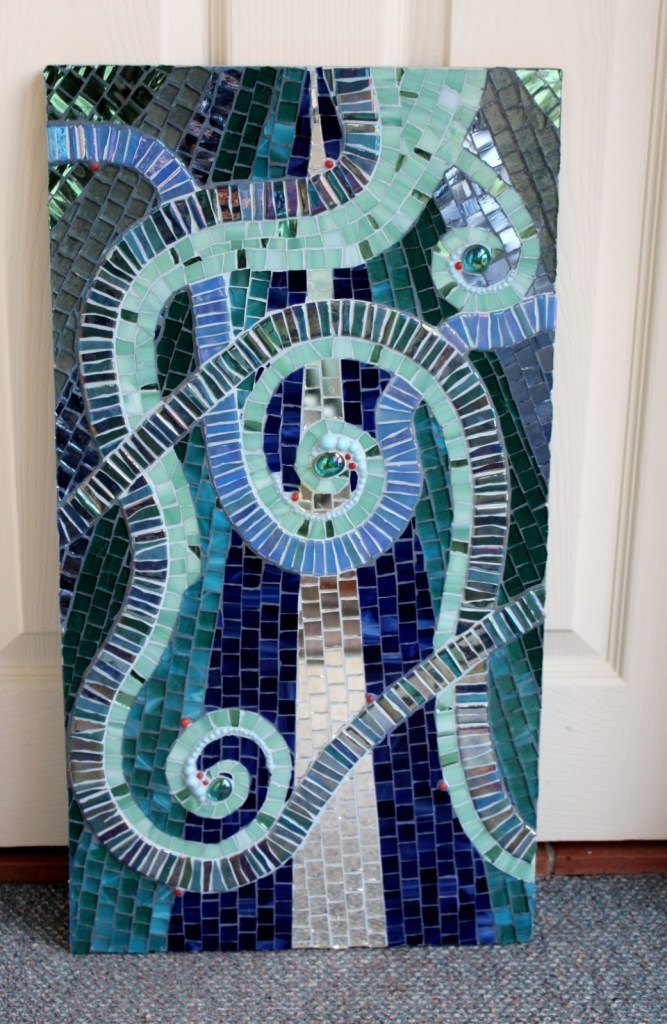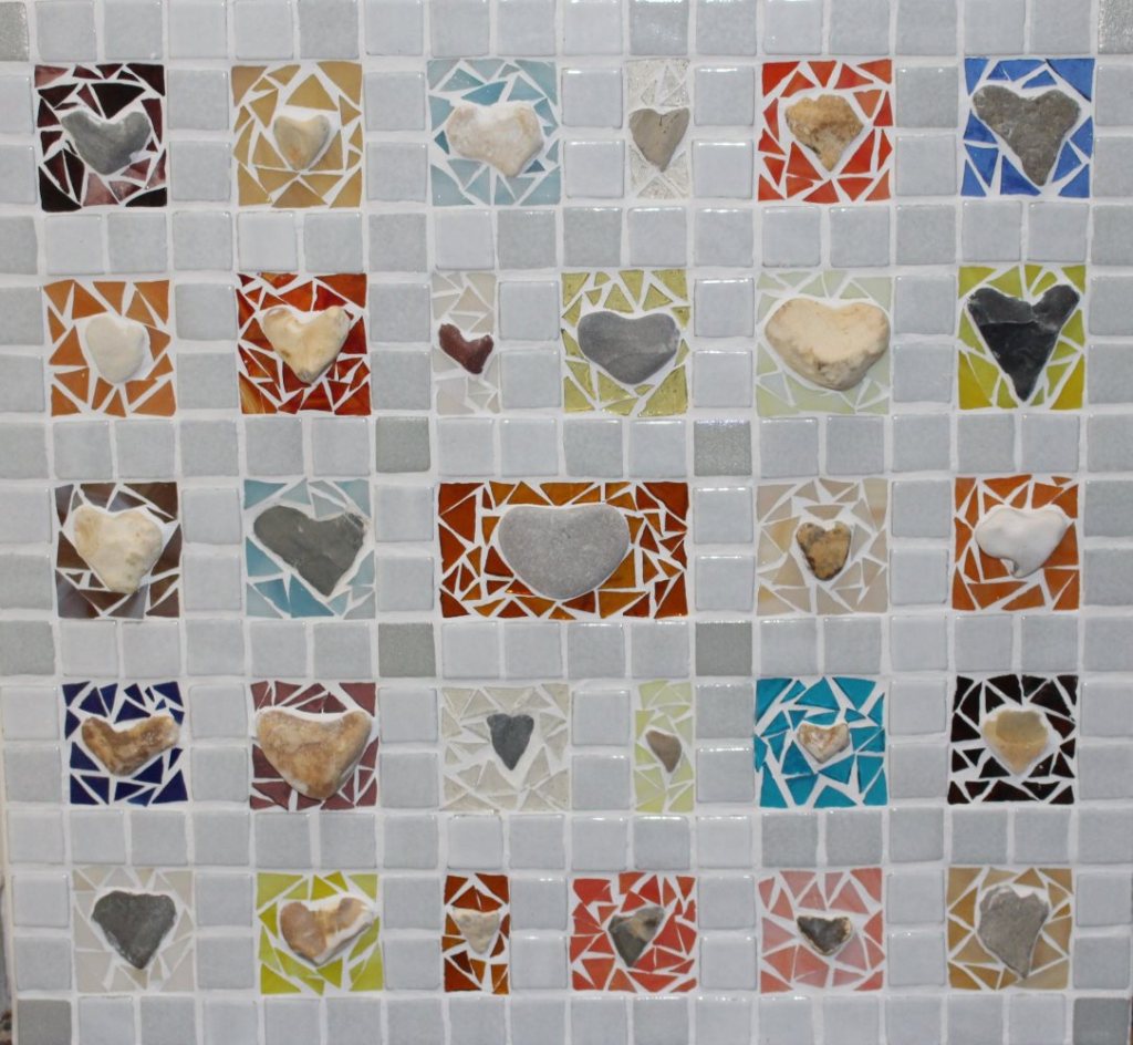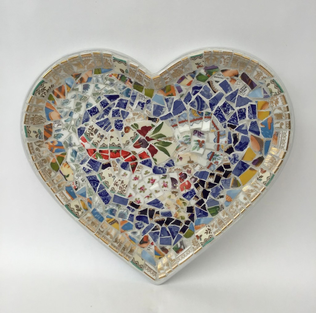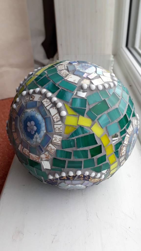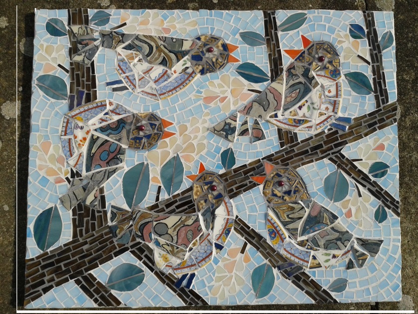 It was the fragility of paper that made me look for something more enduring and permanent, which I found in mosaic. I wanted something which would stand the test of time to contrast with paper’s delicacy. I love assembling a new creation, especially when I find a piece of beautiful stained glass or a lovely broken treasure. Rather like doing a jigsaw, it’s very relaxing. Sometimes I incorporate unusual or discarded objects which have stories of their own to tell, making an appeal about valuing the overlooked and forgotten.
